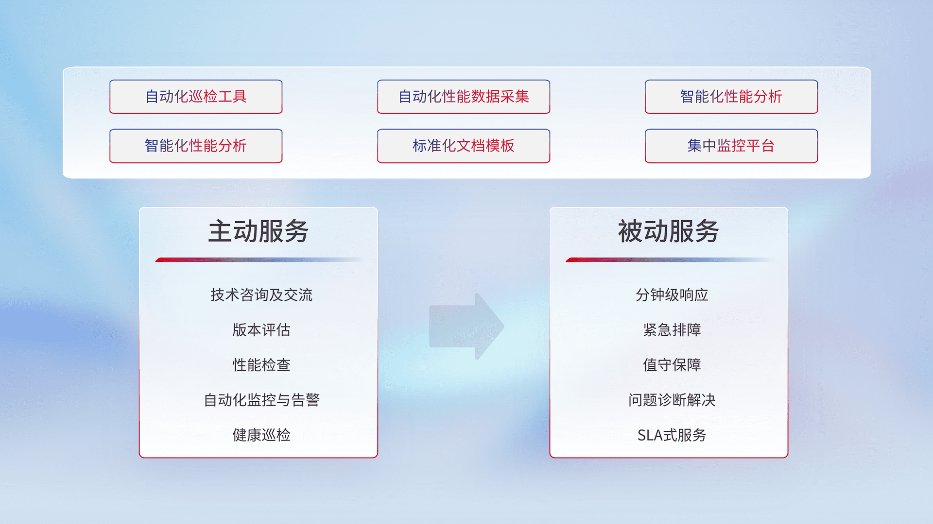 智能化工具和标准化文档,,,保障服务质量,,提供主动服务(包含技术咨询、、、、版本评估、、、性能检查、、、自动化监控与告警、、健康巡检)和被动服务包含(分钟级响应、、、紧急排障、、值守保障、、问题诊断解决、、、、SLA服务)。。